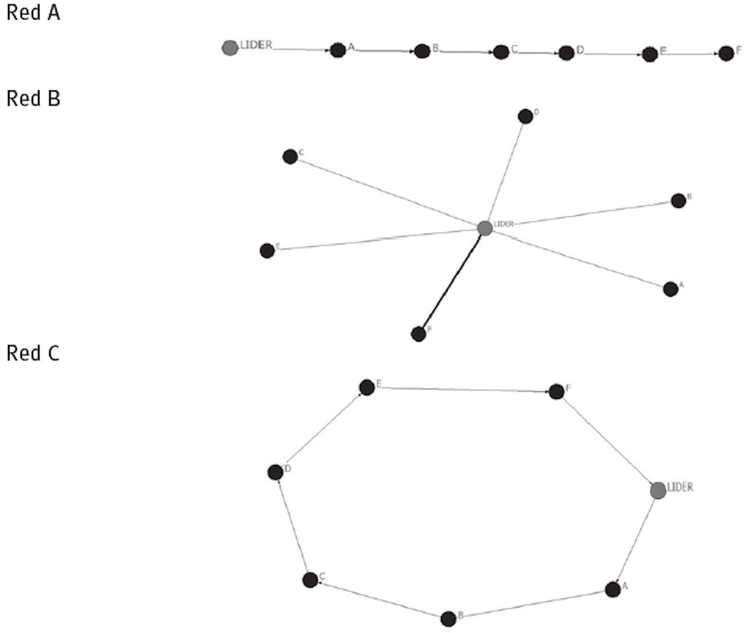 Las redes sociales reales son un patrón particular de conexiones entre no dos, de un conjunto muy amplio de posibles patrones. En las redes se observan diversas topologías, o arreglos de elementos y relaciones (Wasserman y Faust 1994). Estas topologías permiten analizar algunas características de estructuras sociales generalizadas; por ejemplo, las redes de liderazgo (político, religioso, organizacional) y las estructuras sociales jerárquicas, recurrentes en la vida social. Las redes de tipo lineal (red A de la Figura 1), o circular (red C) no son buenas descripciones de redes con liderazgos fuertes. En cambio, la topología de una estrella sociométrica (red B), podría modelizar una red con un liderazgo centralizado. En esta red, los nodos se conectan, en forma real o potencial, a través del “líder”,22 o, de un modo similar, los individuos en religiones monoteístas se conectan en forma real o potencial a través de una divinidad, o un “nodo dios” (Oliva 2019). En este modelo, sin este nodo central, el resto de los vértices quedarían desconectados entre ellos. Estas tres topologías se observan en la Figura 1.23
