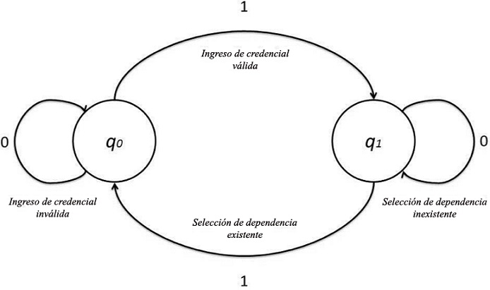 Una vez ejecutado lo anterior y determinado que la credencial es válida, se transitará hacia el siguiente estado, en el cual se señalará cuál dependencia gubernamental se visita, pudiendo ser esta existente o no existente. En el caso en que se ingrese una dependencia existente, la maquina expenderá una credencial de visitante con la simple rúbrica visitante autorizado y se pasará al estado inicial, para que otra persona vuelva a realizar el proceso. Esta estructura se puede diagramar como se muestra en la Figura 1.