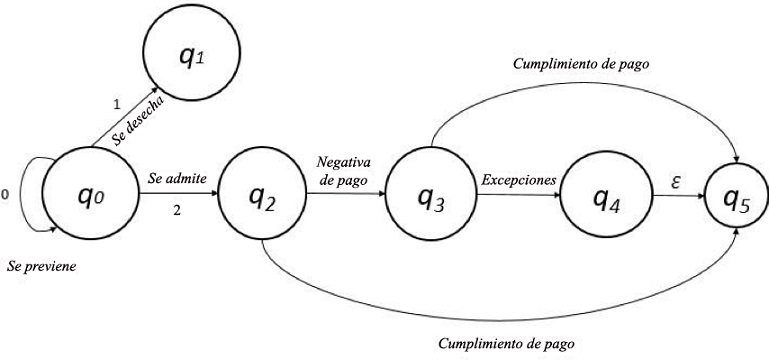 Para el desahogo del asunto que precede, sería necesaria la definición formal del correspondiente autómata judicial. La quíntupla se compone por el conjunto de estados finitos Q, en este caso Q = {q 0, q 1, … q 5}. El alfabeto Σ = {0, 1, 2, Ɛ}.4 Un estado inicial q 0 perteneciente al conjunto de estados Q. La función de transición T, que debe cumplir con las condiciones anteriormente descritas. Por último, el conjunto de estados finales F que pertenece a Q, sea F = {q 1, q 5}.