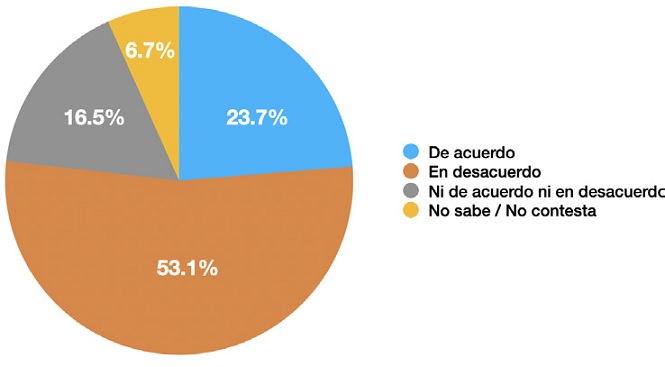 Aproximadamente una de cada tres personas está de acuerdo y la misma proporción está en desacuerdo. También son uno de cada tres aquellos que no están de acuerdo ni en desacuerdo y que no saben o no contestan.
