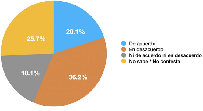 Hay un importante porcentaje de desconocimiento (43.8%) dado que un 18.1% no está de acuerdo ni en desacuerdo y un 25.7% no sabe/no contesta y está de acuerdo con esta afirmación el 20.1%