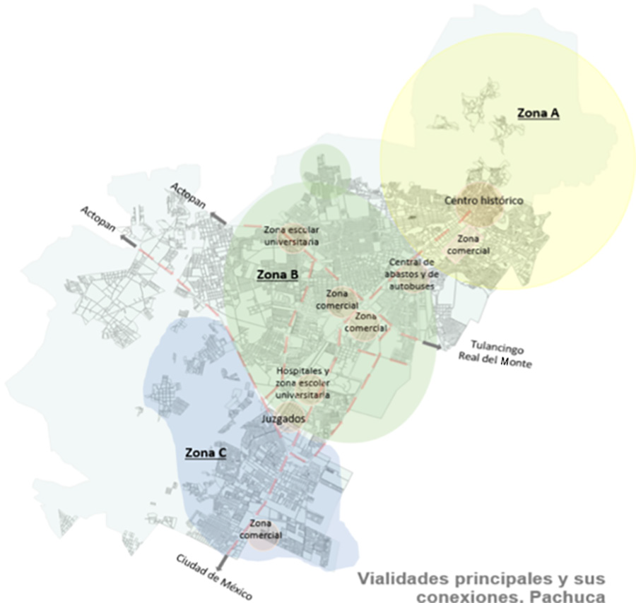 Para asociar los costos de la vivienda en los distintos fraccionamientos con su ubicación, se elabora una zonificación general de la ciudad. Para esta última, se consideraron las vialidades de mayor tamaño e importancia en la ciudad. Mismas que conectan la ciudad de Pachuca con otras localidades urbanas importantes dentro del estado (Actopan, Tulancingo y Real del Monte) y fuera de él (Ciudad de México). Cabe mencionar que dichas vialidades obedecen al crecimiento histórico de Pachuca, de norte a sur, sobre la avenida Felipe Ángeles, en dirección a Ciudad de México. Así como las zonas que concentran en mayor medida los servicios, que a su vez se emplazan sobre dos de las avenidas más importantes de la ciudad, Av. Felipe Ángeles y Bulevar Colosio. La primera, al conectar el centro de la ciudad con la Ciudad de México, y la segunda que la atraviesa de este a oeste y conducen la ciudad y conectan con Tulancingo, Real del Monte y Actopan.