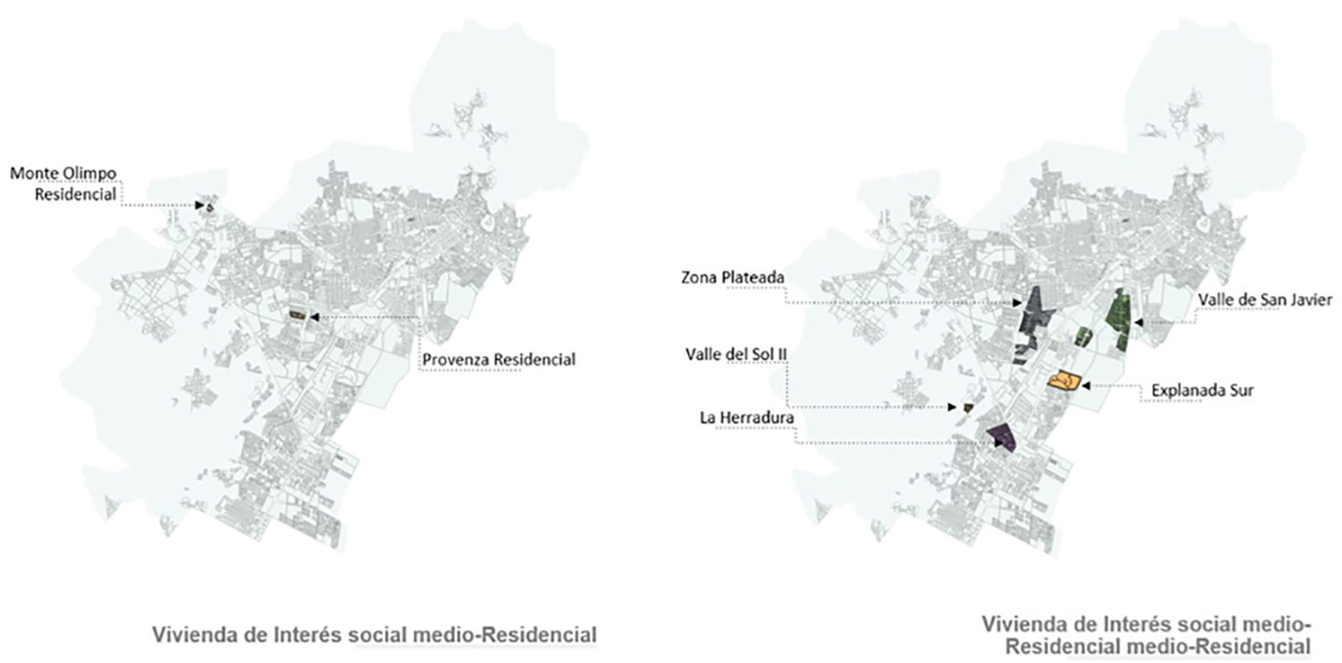 En la Figura 5, se muestra, del lado derecho, el fraccionamiento que oferta vivienda residencial medio y residencial. Ubicadas en el perímetro B, estas viviendas tienen costos que están entre los 5.5 y 7.5 millones de pesos. Mientras que el fraccionamiento que únicamente oferta vivienda residencial se encuentra ubicado también en la zona B y se puede ver en el mapa de la derecha, con costos que van desde los 8.5 hasta los 28 millones de pesos. Sin embargo, no es vivienda nueva como tal, pero se anexa por ser el único fraccionamiento que oferta vivienda residencial de este tipo en el municipio.