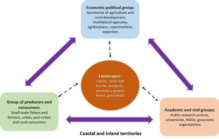 Regarding the conceptual framework for the research (although each RIT would choose one that suits its conditions), here we propose the model of local socio-environmental systems (LSES) as a basis for reflection (Parra-Vázquez et al. 2020) (Figure 1). The LSES portrayed in Figure 1 is a production system in which it is explicitly recognized that its functioning has been conditioned for several decades by the rules imposed by the global multilevel food regime. Under this premise, the possibility of small-scale producers maneuvering to make major changes within the system is limited (Parra-Vázquez et al. 2020). A LSES refers to a complex small-scale production system, located in coastal-marine (fishing) and/or terrestrial (agricultural) territories. Each production system uses the landscape units contained in its territory as resource base or as inputs. Three main human groups interact in each LSES: a) group of producers and consumers; b) the socio-academic group, which can include people with various profiles, for example, professionals, researchers and representatives of NGOs; and, c) the economic-political group comprising government officials from the three levels of administration, as well as middlemen and entrepreneurs (Figure 1).