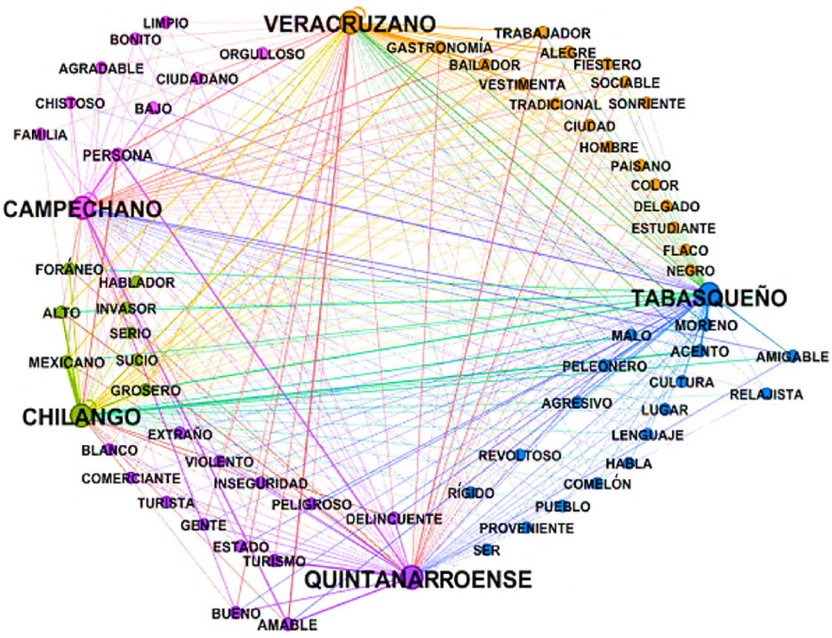 El lenguaje organiza la cognición y esta, a su vez, influye en las interacciones, palabras y significados de las asociaciones semánticas de los locales hacia los grupos culturales, tienen una dimensión sociocognitiva. En lo referente a la posibilidad del encuentro intergrupal, definidoras como alegre, sociable, sonriente, amigable, bueno, amable, agradable, limpio, entre otras, compartidas por cuatro de los cinco estímulos (Figura 1), son características que facilitarían la apertura. De esta forma, las características conservadoras de los yucatecos (Figueroa 2013; Sierra Villarreal 1995) podrían influir en la necesidad por mantener el sentido de armonía en las relaciones (Triandis 2000), así como resultar en estereotipos y prejuicios hacia otros grupos, debido a la percepción de amenaza (Stephan y Stephan 1996). En este sentido, se identifican elementos que podrían generar conflicto en las relaciones intergrupales, ya sea como resultado de eventos históricos y políticos, como es el caso de chilango, o por diferencias en el lenguaje como sucede con tabasqueño, o con la CA negativa en quintanarroense, reflejo de las percepciones sociales y vehículo de creencias, prejuicios y valores regularmente no conscientes en la cotidianeidad. Se han reportado resultados similares en donde las ideologías conservadoras del endogrupo influyen en prejuicios hacia los exogrupos (Caricati, Mancini y Marletta 2017).