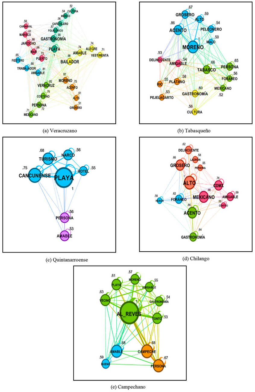Se consideró relevante explorar la red de palabras por estímulo, para determinar la configuración de cada una de ellas en relación con su propio significado. En promedio se produjeron 408 nodos con un rango de 428 a 385 por palabra estímulo. El promedio de las aristas fue de 2,418, rango de 2,050 a 2,597. Se obtuvieron los valores de centralidad de los grafos no dirigidos para cada una de las palabras estímulo, calculando la media de nodos adyacentes (M Grado), la media de grado más la fuerza de las relaciones (M grado con pesos) y la distancia media del grafo entre todos los pares de nodos (diámetro de la red), lo cual indica cómo están de lejos los dos nodos más alejados dentro de la red. El estímulo con menor número de nodos fue campechano (385), seguido por veracruzano (398), tabasqueño (415) y quintanarroense (418). Chilango fue la palabra con mayor número de nodos (428) y menor número de aristas (2,050), dando como resultado para cada nodo una media de 9.57 nodos adyacentes (M grado) con peso ponderado medio de 17.04 (M grado con pesos) y una distancia de tres entre cualquier par de nodos (diámetro de la red = 3). El valor medio de cada una de las demás palabras estímulo fue muy cercano entre ellas, con grados medios de entre 12.30 a 12.56, grados medios ponderados de entre 29.84 y 33.64 y una distancia entre cinco y seis nodos para cada par dentro de las redes (Tabla 2).