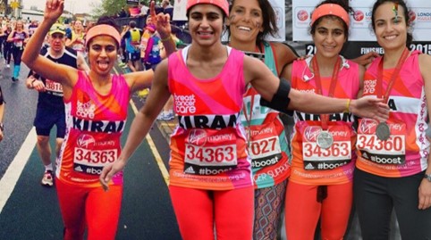 Imagen 1 Collage de tres fotografías de Kiran Gandhi en la maratón de Londres en 2014.