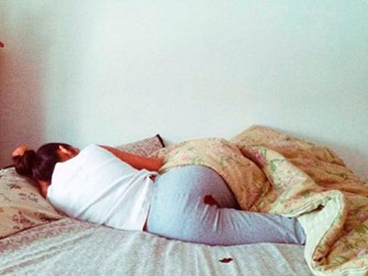 En la primera imagen se puede observar un collage de tres recortes de fotografías, realizadas por la música y activista Kiran Gandhi durante la maratón de Londres con la práctica del sangrado libre, para visibilizar el ciclo menstrual como parte de un proceso orgánico, el cual viven muchas (no todas3) las personas con útero. Kiran decidió “correr y dejar correr” (Thiébaut 2017, 83). El sangrado libre habilita la manifestación del fluido caótico (Barone Zallocco 2021) sin la patriarcal eufemia de sus tecnologías de género (Tarzibachi 2017; Preciado 2008). Aquí me interesa señalar la gran repercusión generada por Kiran corriendo la maratón evidenciando su sangre menstrual como marca de género, utilizando también una remera, la cual reivindica la lucha por el cáncer de mamas. Resulta relevante considerar que la construcción de esta imagen se contrasta con las memorias visuales de la indisposición de una tradición biomédica, la cual comprendía el sangrado del ciclo menstrual como cuerpo enfermo, a la vez de visibilizar una corporalidad vital sin requerir de las tecnologías del femcare (toallas y tampones descartables) para su actividad, por tanto, problematiza dos imaginarios comúnmente asociados con el ciclo menstrual.