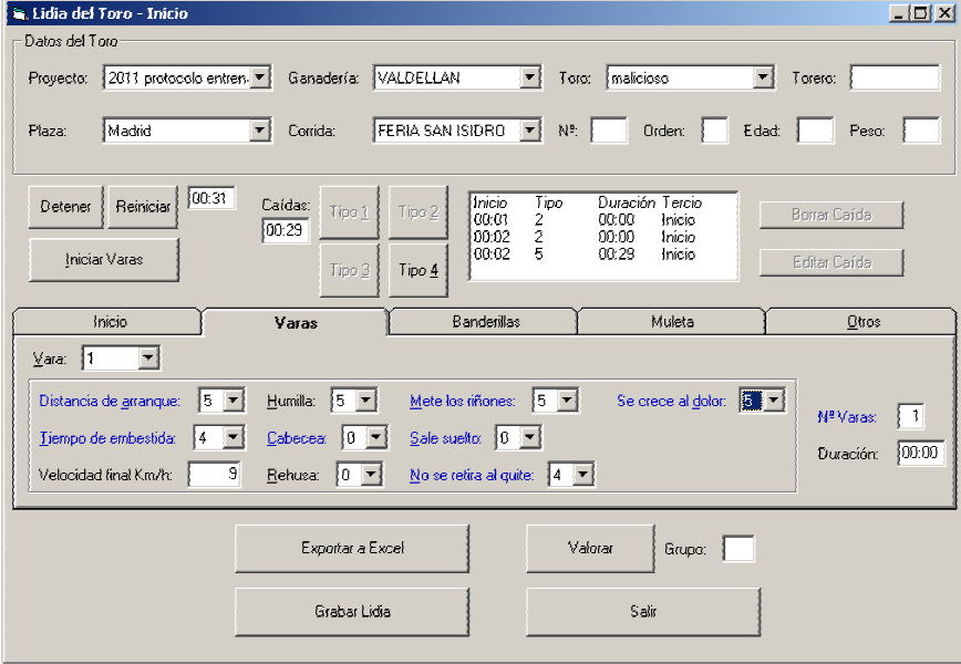 El programa informático utilizado permite evaluar el comportamiento del animal durante la lidia, para lo cual, al finalizar cada una de las partes del espectáculo se presentan en pantalla las variables que deben ser ponderadas de 0 a 5 puntos. Estas notas de comportamiento de cada animal estudiado son grabadas en un archivo informático independiente tipo Excel, junto con los tiempos de cada tercio (en segundos). Los resultados estadísticos se han obtenido haciendo uso del programa Statistica para Windows.
