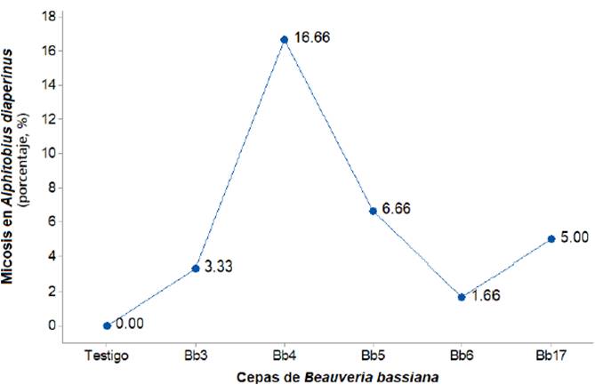 Los resultados mostraron que todos los aislamientos fúngicos fueron patógenos contra escarabajos A. diaperinus, con una mortalidad inducida por micosis del 16.66% como máximo y con diferencias significativas entre cepas (Bb3, Bb4, Bb5, Bb6 y Bb17). Estos resultados son similares a los reportes de (Rohde et al., 2006; Rezende et al., 2009), quienes trabajaron con el mismo escarabajo. Se ha descrito que el primer contacto entre