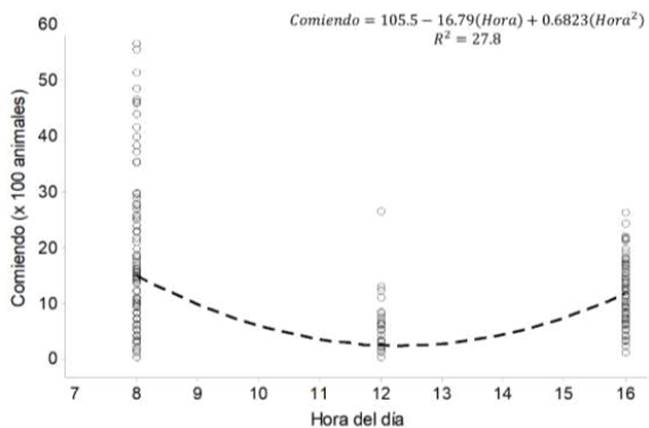 Los bovinos estuvieron con mayor (P < 0.05) frecuencia, comiendo, tomando agua y en posición de pie a las 8:00 y 16:00 h; mientras que a las 12:00 la mayoría (P < 0.05) de bovinos estuvieron echados y rumiando bajo la sombra; el comportamiento de acicalamiento fue mayor (P < 0.05) a las 16:00 h, seguido de las 8:00 h (P < 0.05) y más bajo (P < 0.05) a las 12:00 h. Pereyra et al. (2010), refieren que cuando los bovinos se encuentran expuestos a condiciones adversas a su estado de confort, disminuyen actividades habituales, tales como comer, beber y caminar. Bajo la condición climática de la región donde se ubica la UPP, la tendencia de los bovinos es a disminuir sus actividades habituales; tal como se muestra en la figura 2, la cual muestra el efecto cuadrático para la variable bovinos comiendo, según la hora del día. Un 27.8 % de la variación de los bovinos comiendo depende de la hora del día.