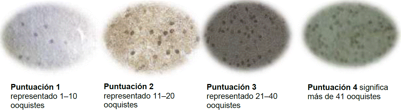 Para evaluar E. maxima micro, se utilizó la técnica de raspado de la mucosa intestinal para el recuento de ooquistes, realizada en la porción intestinal que rodea el divertículo de Meckel. El contenido fecal se depositó en un portaobjetos, se cubrió con un cubreobjetos y se visualizó en cinco campos (extremidades y centro) para contar ooquistes bajo microscopía óptica (100x). Se utilizaron cuatro puntajes para la clasificación, según Vetanco do Brasil (2011), donde el puntaje 0 representó ausencia de ooquistes; la puntuación 1 representó de 1 a 10 ooquistes; la puntuación 2 representó 11-20 ooquistes; la puntuación 3 representó 21-40 ooquistes, y la puntuación 4 significó más de 41 ooquistes, por ejemplo la figura 2 .