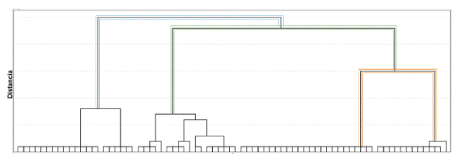 Para realizar la tipología de la ganadería familiar en la comunidad Totonaca, se procedió a clasificar a las familias, de acuerdo a la tenencia de especies pecuarias en su traspatio. Solo se encontraron cuatro especies: cerdos, gallinas, guajolotes y patos. Usando esta variable, se realizó un análisis multivariado que permitió agrupar la propiedad del ganado en el traspatio de las familias. Se utilizó un análisis de conglomerados con el método de Ward y la media euclídea al cuadrado. Se encontraron tres grupos como se muestran en el dendograma de la figura 1.