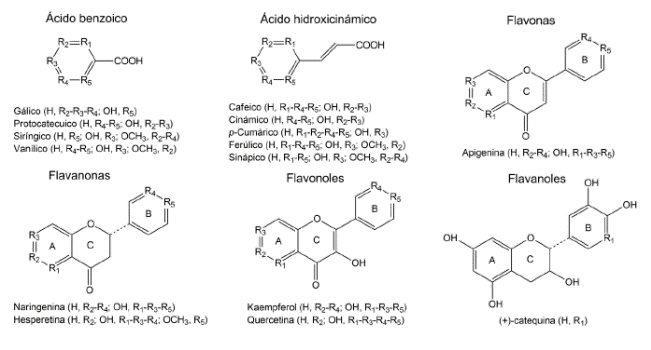 Además, existe evidencia reciente de algunos ácidos orgánicos (nítrico y cítrico, entre otros) encontrados en subproductos agroindustriales; así como pigmentos (carotenos) y compuestos fenólicos (figura 3), que incluyen a los ácidos fenólicos y flavonoides (Dreher & Davenport, 2013; M´hiri et al., 2017; Rosero et al., 2019; Scully et al., 2016). De este último grupo de compuestos, en semilla seca de manzana y pulpa, se han identificado a los ácidos gálico, cafeico, y protocatecuico (Dadwal et al., 2018); además, se encontró la presencia al ácido cinámico y clorogénico en pulpa seca de manzana (Dadwal et al., 2018; García et al., 2009). Por otra parte, se ha reportado la presencia de ácidos cafeico, p-cumárico, ferúlico, sinápico, siríngico y vanílico, así como los flavonoides (+)-catequina, quercetina, apigenina y kaempferol en semilla y cáscara fresca de aguacate (Rosero et al., 2019). Mientras que en cáscara de zanahoría seca, cáscara seca y fresca de papa, así como en bagazo de café, algunos estudio reportan la presencia de ácido clorogénico (Friedman et al., 2017; Panusa et al., 2013; Zhang y Hamauzu, 2004). Otros de los subproductos que se han analizado son las cáscaras de toronja, limón y mandarina, en las cuales se reporta la presencia de los ácidos cafeico, p-cumárico, ferúlico y sinápico; así como, los flavonoides hesperidina y naringenina (M´hiri et al., 2017). Estos flavonoides se han encontrado también en semilla seca de mandarina y naranja (Moulehi et al., 2012).