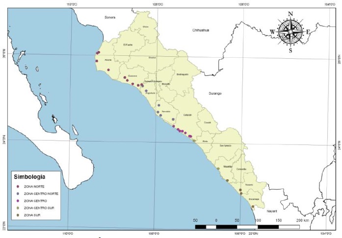 Se obtuvo una base de datos de cuerpos de agua costeros, así como en granjas de camarón ubicados al Noroeste de México, específicamente sobre la línea de costa del Estado de Sinaloa (Figura 1) durante el 2017 en el que se efectuaron diez muestreos en 26 granjas de cultivo en el primer ciclo (febrero-junio) y 18 en el segundo (julionoviembre). Las zonas de muestreo fueron zona norte: Ahome y Guasave, zona centro norte: Angostura y Navolato, zona centro: Eldorado y Cospita, zona centro sur: Elota y zona sur: Mazatlán. Durante los primeros 30 días de cultivo los muestreos se realizaron semanalmente, por considerarse como la etapa crítica (Hong et al., 2016), posteriormente, los muestreos se realizaron cada dos semanas.