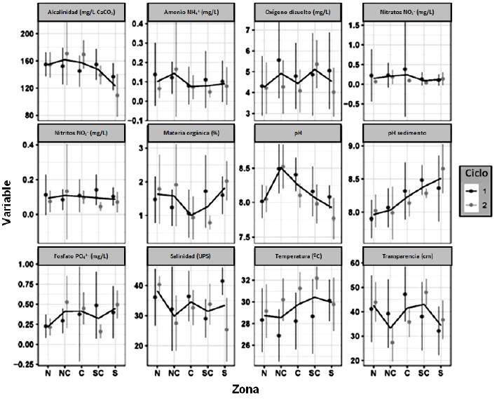 Figura 2 Promedio ± desviación estándar por zona y ciclo de cultivo de las variables fisicoquímicas y biológicas en las granjas de camarón en la región noroeste de México. N = Norte, NC = Norte Central, C = Central, SC = Sur Central y S = Sur. La línea negra marca la media entre ciclos de cultivo.