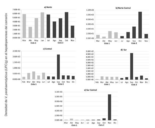 Con relación a la presencia de V. parahaemolyticus en el hepatopáncreas de los camarones, se observó que, en la zona norte del Estado, se encontró la mayor densidad de V. parahaemolyticus en ambos ciclos de producción (Figura 3a), conforme los muestreos se dirigieron al sur del Estado, se observa una clara tendencia a disminuir la concentración de V. parahaemolyticus. También se pudo observar que, en la zona norte central, hubo mayor concentración de bacterias durante el mes de octubre y solo durante el segundo ciclo de producción (Figura 3b), en la zona central y sur del estado destaca el mes de septiembre (Figura 3c y d); y para el caso de la zona sur central el mes de noviembre (Figura 3e).