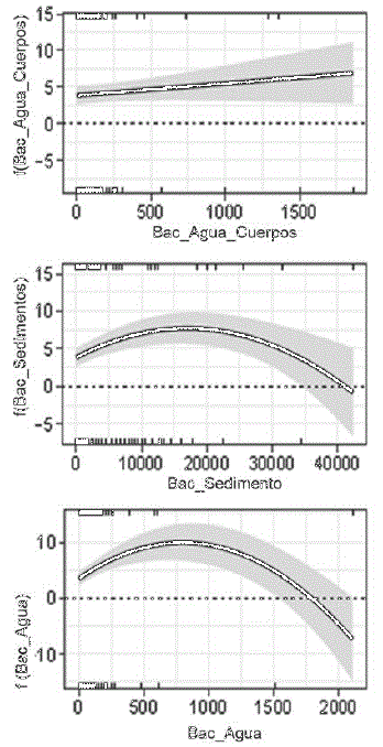 El modelo indicó que la densidad de V. parahaemolyticus en el hepatopáncreas se incrementa en la medida en que la concentración de bacterias encontradas en el agua de los cuerpos costeros aumenta (Figura 4). Una tendencia similar de la concentración de bacterias en los sedimentos y en el agua, mostraron que concentraciones intermedias aumentaron la densidad de V. parahaemolyticus en el hepatopáncreas, sin embargo, concentraciones mayores a valores intermedios, mostraron una disminución (Figura 4).