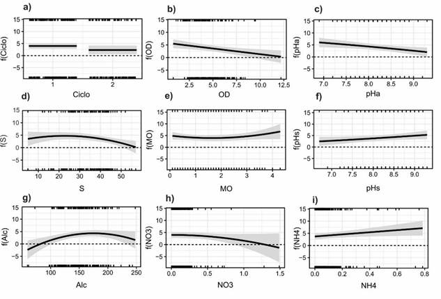 En cuanto al ciclo de cultivo, el ciclo 1 favoreció mayormente la densidad de V. parahaemolyticus que el ciclo 2 (Figura 5a). De manera general, valores mayores del oxígeno disuelto, pH, Salinidad y los nitratos en el agua, la densidad de V. parahaemolyticus disminuyó (Figura 5b, c, d y h, respectivamente), contrario a lo que ocurrió con la materia orgánica, el pH del sedimento, la alcalinidad y el amonio, que mientras aumentaron sus valores, mayor densidad de V. parahaemolyticus se observó (Figuras 5e, f, g, e, i, respectivamente).