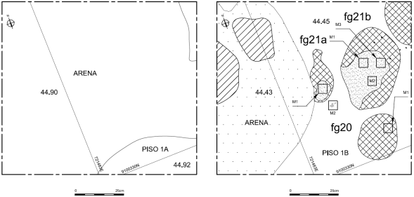 Se trata de tres estructuras de combustión del tipo fogón plano, de acuerdo con la tipología para Huaca de la Luna (Castillo et al. 2015). Inicialmente se consideró que el Fg21a y Fg21b eran una sola estructura; estos fogones fueron identificados tras la limpieza del pozo de huaqueo que destruía el lado oeste del piso 1a; el cual permitió identificar el piso más temprano -piso 1b- a 44.45 msnm (Figura 11). Aunque no fueron excavados, se realizaron los muestreos sistemáticos para esta investigación.