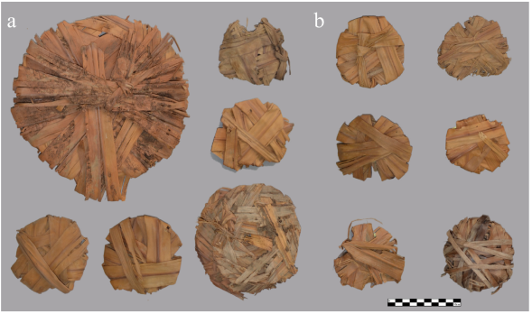 Se trata de objetos conformados por hojas foliares dobladas a manera de disco u ovillo con nudo. La muestra está conformada por 54 elementos (10.4% del total de la muestra); la mitad de estos objetos se encontraban en muy buen estado de conservación (completos); la mayor parte (79.6%) corresponde a objetos elaborados de Gynerium sagittatum “caña brava”, seguidos del “carrizo” Phragmites australis (16.7%) y en menor proporción un objeto de Typha angustifolia enea y otro del cual no se pudo identificar la especie.