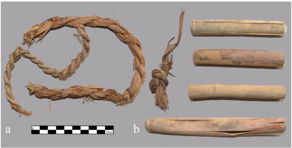 Según la forma, la mayor parte correspondería a elementos de fibras u hojas foliares con torsión en S o Z. Estas soguillas corresponden a 87.5% del total de la muestra (456 objetos analizados), en gran parte son fragmentos, de los cuales 49 presentaban nudo (Figura 14a). De acuerdo con el origen de la fibra, la mayor parte corresponde a Cyperus sp. “junco” (293 objetos correspondientes a 64.3% de esta forma); la especie que le sigue es el Phragmites australis “carrizo” con 80 elementos (17.5%), después el Gynerium sagittatum “caña brava” con 14.5%, en menores proporciones se ha registrado elementos hechos de Typha angustifolia “enea” (2.2%), Furcraea sp. “cabuya” y Schoenoplectus sp. “totora” (0.7 % respectivamente) y Agave sp. “maguey” con 0.2%.