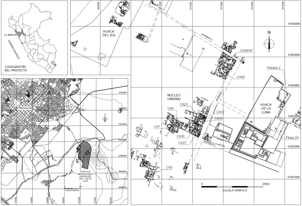 Las evidencias registradas por más de 25 años de investigaciones indican que existen tres grandes periodos en la historia del sitio Huacas del Sol y de la Luna. Los dos primeros corresponden a la ocupación moche, uno en el periodo que va desde el 100 o 200 hasta 650 dC, y otro desde el 650 al 850 dC. El tercer periodo corresponde a las manifestaciones culturales posteriores al abandono definitivo del sitio por parte de los Moches, desde 900 dC y hasta la llegada de los españoles (Uceda 2010). El contexto utilizado para este trabajo se ubica cronológicamente a finales del primer periodo (550-650 dC).