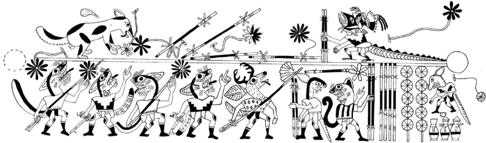 La segunda escena ha sido tomada del artículo de Donnan (1985: 378, fig. 5); donde además reporta la existencia de estas jabalinas con travesaño de madera cubiertas con placas, descubiertas en una tumba durante sus investigaciones en el Complejo Arqueológico Huacas del Sol y de la Luna. Esta escena, similar a la anterior, presenta dos niveles iconográficos (Figura 20). En el primer nivel o inferior se observan dos subescenas, la de la izquierda conformada por cinco personajes antropomorfos (un cérvido y cuatro felinos); tres de ellos portan la jabalina más el objeto purificador elevado, pero los otros dos no; cabe señalar que, en dos de ellos, el objeto mencionado ha sido graficado de planta y da la impresión de que se tratase de una flor. La subescena de la derecha pareciera un depósito o un espacio donde se aglomeran las jabalinas y más objetos, pero circulares que guardan mucha similitud con los objetos de paja registrados en el relleno del piso 1a. Asimismo se aprecian tres vasijas tipo cántaros con tapa y un personaje (cérvido) que porta una especie de cuenco o plato. Al otro lado se aprecian dos personajes (felino y cérvido) en posición de estar tomando las jabalinas y reunirse con el resto del grupo. El nivel superior presenta una iguana sosteniendo dos jabalinas; mientras que en el otro extremo se encuentra la mascota del PACS (perro). Entre ambos personajes se pueden apreciar varias jabalinas, algunas en el aire y otras en el piso; sucede de igual forma con los objetos rituales. Sin embargo, llama la atención aquel que cae a la espalda del personaje cérvido con cuenco (extremo derecho de la imagen). Se trata del ovillo u objeto de paja y aplastado sostenido por una soguilla y lastre, representado como si estuviera cayendo.