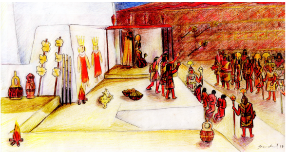 Está de más hacer hincapié en que en este espacio arquitectónico se habrían realizado ritos similares a la Citua, que consistía principalmente en lanzar los objetos de paja a los guerreros vencidos y vencedores, así como al público (élite) espectador reunido en la plaza principal del templo (Figura 22).