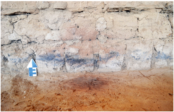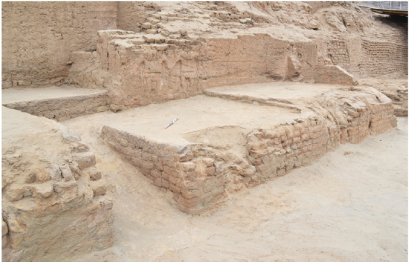 Al sur de la rampa R7A se encuentra una especie de atrio con banqueta (B10A); el cual presentaba un muro límite al sur con vano de acceso que permitía la comunicación con un pequeño espacio denominado: Recinto 5A (Figura 4). El atrio debió estar techado, a juzgar por la presencia de tres hoyos de postes en el extremo oeste. El muro este y el sur presentaban los paramentos decorados con relieves, en los que destacan dos oficiantes tomados de la mano y cuatro paneles donde se habrían representado personajes del panteón moche, cuyo estado de conservación no permite definirlos con claridad, pero se ha optado por denominarlos temas complejos 3 y 4.1 Dentro del Recinto 5A se encontraba un forado de huaqueo; el cual permitió identificar arquitectura y pintura mural asociadas con el edificio anterior. La decoración era distinta a la del último edificio: diseños geométricos pintados de color blanco, rojo y amarillo.
