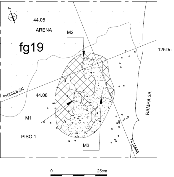 Se trata de una estructura de combustión del tipo plano (Castillo et al. 2015). El fogón tiene una planta de forma ovoide, a partir de la huella el piso 1a de la Terraza 2-Sección B, el cual está altamente termo alterado (oxidación de los sedimentos) y en la parte central presenta una coloración gris (Figura 3). Sus dimensiones son: 0.38 m de largo en su eje sur-norte por 0.25 m de ancho y a una altura inicial de 45.08 msnm. Al sureste, en el paramento de la rampa R3A se observa una huella de incendio (TI3); sin embargo, es poco probable sugerir que esta alteración térmica sea producto del calor ocasionado por este fogón (Figuras 9 y 10).
