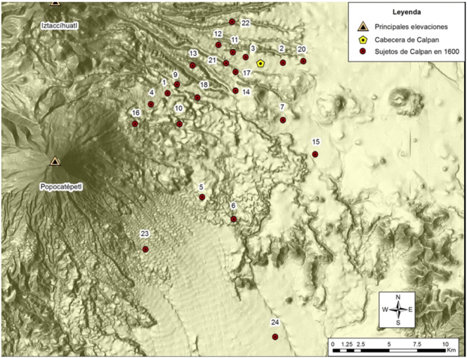 En la época colonial, Calpan fue reconocido como pueblo de indios y su cabecera se encontraba en las faldas del volcán Popocatépetl, cerca de la de Huejotzingo (Figura 1). Según la información del códice Elecciones de Calpan de 1578 (BnF, Fonds Mexicain 73) y la Relación de los lugares de 1600 (Ruz y García-Morís 2018), para inicios del siglo XVII Calpan tenía 24 sujetos (Hernández 2018: 48). Éstos se encontraban distribuidos en las faldas de los volcanes, cerca del Pedregal de Nealtican y de la Villa de Carrión (Figura 2 y Cuadro 1).