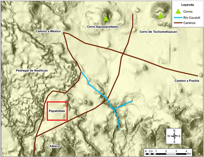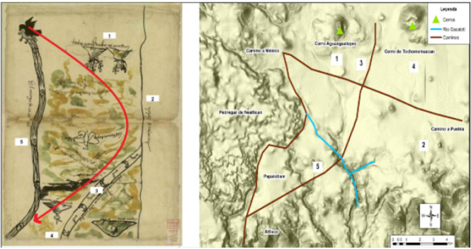 En cuanto a la geografía representada, es importante decir que ninguno de los nombres mencionados para los distintos cerros persiste en la actualidad, tampoco el nombre del río coindice con los actuales. Los elementos clave que nos ayudaron fueron las referencias al Pedregal de Nealtican, los caminos mencionados y el dato de que se encontraban cerca de los límites con Cholula (Figura 8).