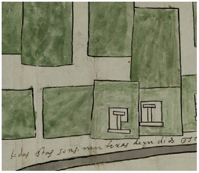 Figura 13 Representación de puertas en las cercas: a) en la cerca general (AGN, Fondo MAPILU: Mapas, Planos e Ilustraciones 1947); b) en la cerca al este de Zinacantepec (AGN, Fondo MAPILU: Mapas, Planos e Ilustraciones 1610).