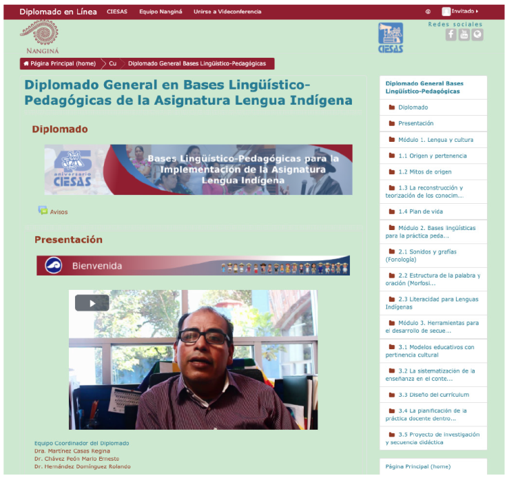 Dentro de la plataforma, disponible en el sitio https://www.nangina.mx/, los docentes contaron con toda la información de educación continua para su formación. Se crearon videos de introducción general y para cada módulo y tema, seguidos de los contenidos desglosados, así como lecturas, textos digitalizados, enlaces de páginas electrónicas y material diverso complementario. Todo bajo una estructura de fácil navegación y búsqueda. La base en Moodle de la página, así como las conexiones presenciales y a distancia propició más de 120 horas de trabajo, para cada uno de los grupos de las 18 lenguas participantes. La página de los diplomados sigue activa y abierta para todos los interesados: https://ciesas.nangina.mx/login/index.php (ingresar como invitado). Evidentemente, la conexión a internet representó un reto para muchos participantes y, en los casos más complicados, se intensificaron los talleres presenciales.