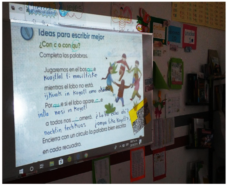 A diferencia de aquellas perspectivas que privilegian las fronteras lingüísticas y, en consecuencia, culturales, los profesores nahuas han empezado a tomar conciencia de que es necesario hablar (nombrar) y enseñar en y para la diversidad, tal como se observa en la Figura 7 -que pertenece al trabajo final de un profesor nahua de Tlaxcala- donde los niños aprecian que las lenguas pueden “convivir” sin mayor conflicto y que las grafías pueden llevarse bien incluso cuando pertenecen a sistemas lingüísticos diferentes.