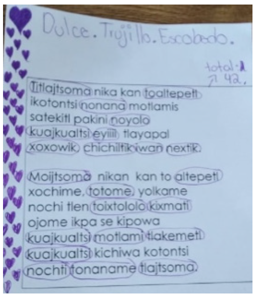 Educar en y para la diversidad constituye el principio fundamental para alcanzar la pluriliteracidad, entendida aquí como: el repertorio de literacidades complejo, dinámico e interrelacionado de un aprendiz (Cinganotto y Cuccurullo, 2019). Sin embargo, esto no exime al docente, y mucho menos al alumno, de la duda y la contradicción, como se muestra en la Figura 8, que corresponde al trabajo de uno de los alumnos de la región nahua de Tehuacán. Un hallazgo importante, y al mismo tiempo esperado, de nuestro equipo de trabajo fue constatar que los profesores y alumnos vacilaban entre usar una grafía u otra al momento de escribir en náhuatl, en este caso entre <u> y <w>, como se observa en kuajkualtsi ‘bonito’ y xoxowik ‘verde’, en dicha fotografía.