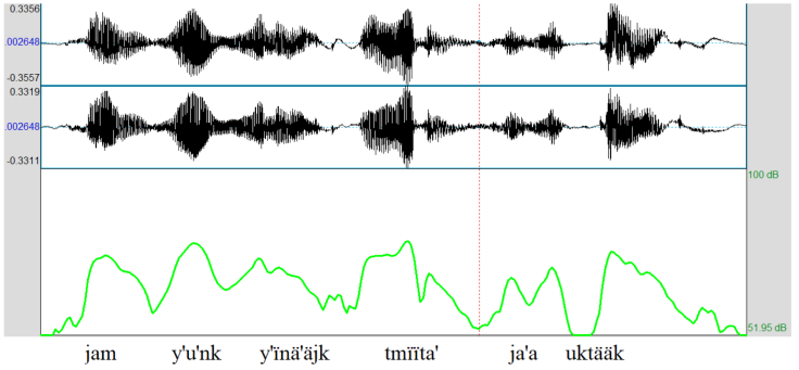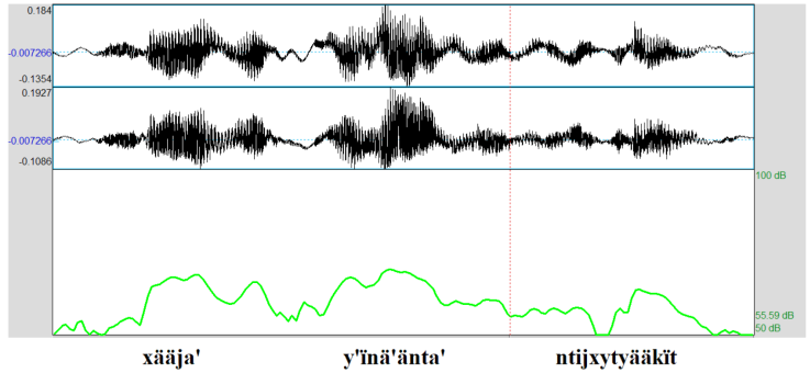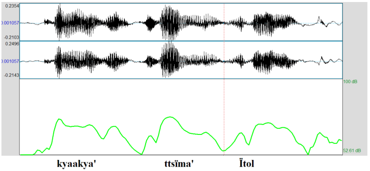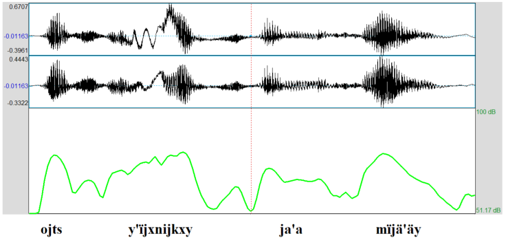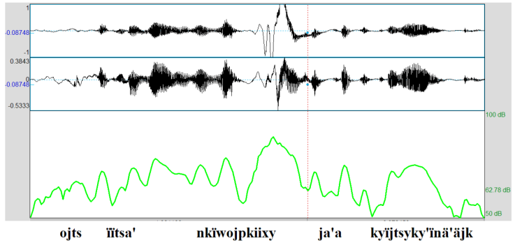 El OP en Z con correferencia pronominal. En el ejemplo (18) presento un ejemplo donde el OP en posición Z presenta correferencia con un pronombre en posición preverbal. La posición de a es ocupada por ïïts ‘nosotros (exclusivo)’, mientras que ja’a ‘él’ refiere al participante OP. Queda claro que existe correferencia entre la FN plena, ja’a kyï-jtsyky’ïnä’äjk, en posición posverbal con el pronombre resuntivo ja’a en posición preverbal. En la Figura 6, muestro que no existe un silencio prominente entre el verbo y la FN en Z. Bajo estos argumentos, no existe evidencia de una pausa entre el predicado y la FN en Z en un argumento extraoracional o antitópico.