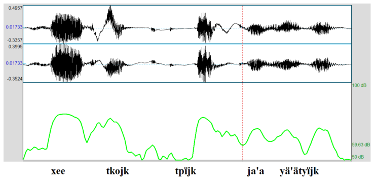 El OP en Z sin correferencia pronominal. En el ejemplo (17) muestro un contexto donde la posición Z es ocupada por una FN plena ja’a yä’ätyïjk ‘señor’ y en posición preverbal tenemos un elemento nulo. Presento la Figura 3 para comprobar que entre el predicado y el FN plena en posición posverbal no existe una pausa como ocurre translingüísticamente.