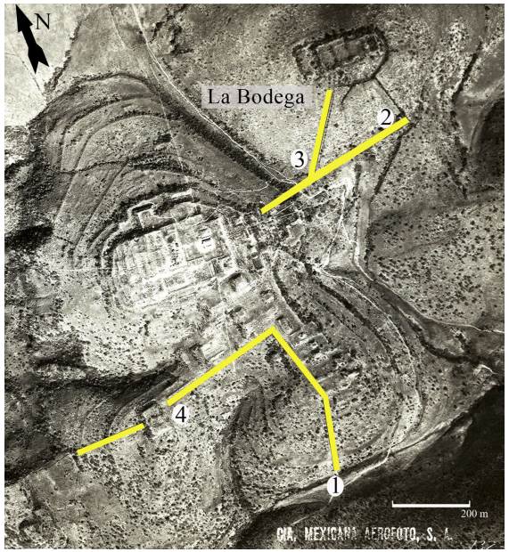 Figura 2 Vista aérea con la indicación de los caminos (líneas) y bastiones (puntos) fuera del Cerro Xochicalco.
