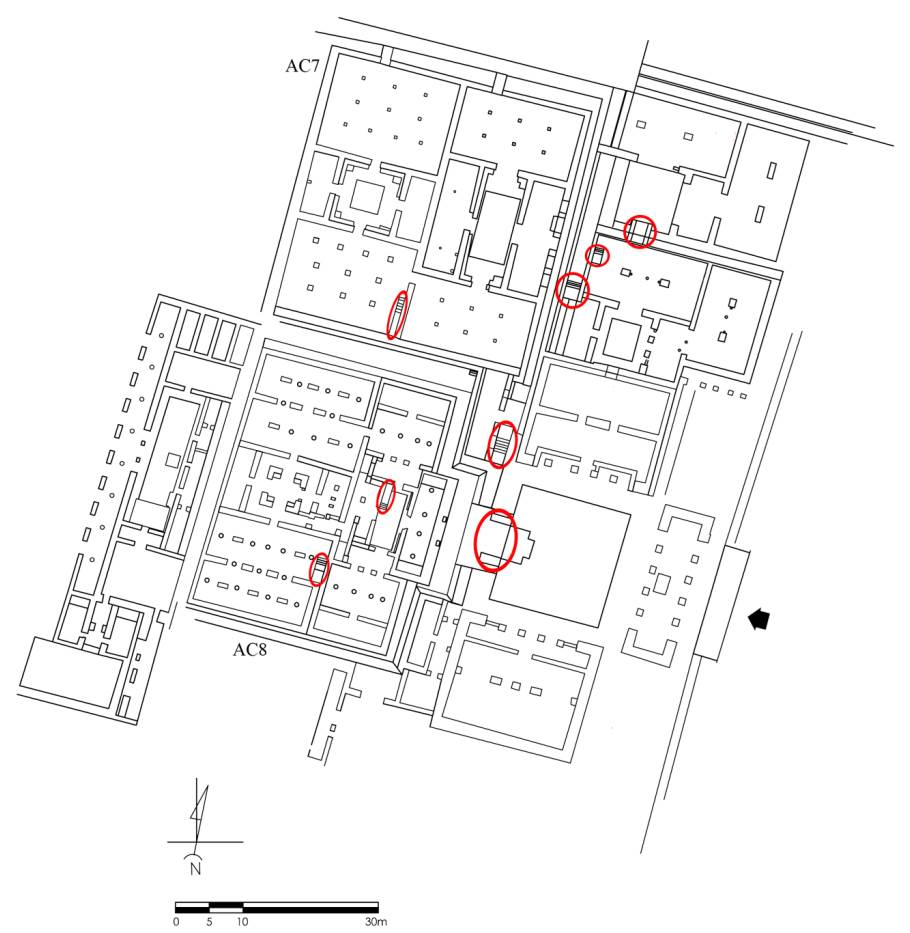 La Acrópolis es un complejo arquitectónico constituido por 12 estructuras intercomunicadas a través de pasillos y escaleras (Figura 6). Cada uno de los edificios presenta el mismo orden espacial: un patio rodeado de habitaciones y solo uno de ellos conformado por dos niveles (Ac8). Los resultados del estudio de los materiales arqueológicos recuperados en las temporadas 1993-1994, 2005, 2006 y 2007, refieren a actividades propias del sistema institucional (Alvarado 2020). Entre ellos, destaca la evidencia de procesos de producción especializados en materiales alóctonos como la concha (Melgar 2009), que una vez terminados fueron distribuidos y utilizados en lugares evidentemente reservados para la clase hegemónica, como en el entierro hallado en la Pirámide de las Serpientes Emplumadas (Melgar 2010). Además, se identificaron áreas específicas para el almacenamiento de alimentos y se registraron otros materiales vinculados al poder centralizado. Esta información, en concordancia con la ubicación, las dimensiones, el carácter multifuncional, el acceso limitado y la privacidad, nos ha llevado a identificar el complejo como la institución palaciega de la ciudad (Alvarado 2015, 2020; Alvarado et al. 2012; Garza et al. 2016).