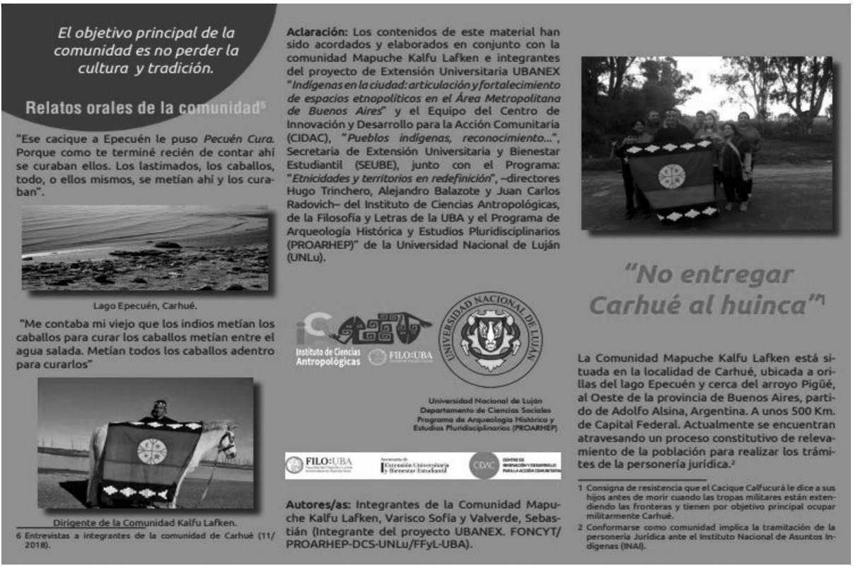 De esta forma, la comunidad Kalfulafken ha partici pado en distintas charlas realizadas en la Universidad de Buenos Aires (UBA) y, además, en 2019 elaboró en conjunto con el Ubanex un folleto de difusión “No entregar Carhué al huinca” (Comunidad mapuche Kalfu Lafken, Varisco y Valverde 2019), el cual contiene un conjunto de temas relevantes y elegidos para ser difundidos por la comunidad (Figura 4). Éste ha sido distribuido por sus integrantes a distintas oficinas municipales del área de cultura, a la Biblioteca Popular Adolfo Alsina, al Museo Regional Dr. Adolfo Alsina y al Archivo Histórico dependiente del mismo. Los y las integrantes de Kalfulafken también asistieron a diversas instancias de difusión de la zona, como la radio local de Carhué. Según la dirigencia indígena, el objetivo de asistir a estos canales de difusión “es para mostrarle a la gente que estamos avanzando y haciendo cosas, que no va a quedar todo en la nada” (dirigente de la comunidad Kalfulafken, julio de 2019).