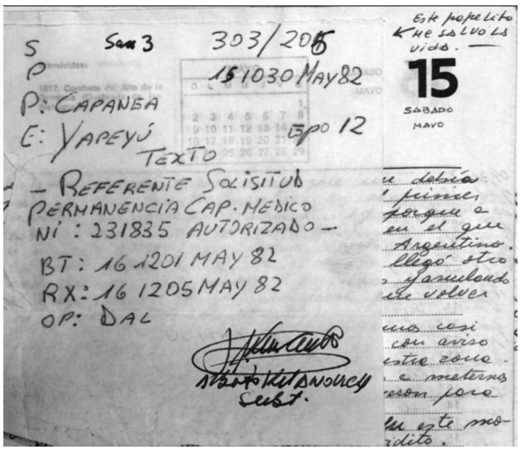 El papel (Figura 3) -un recorte casi minúsculo que demuestra nuevamente su escasez- como medio de comunicación termina por cumplir la función destinada al casco. Al soldado que corrió no se le hubiera ocurrido llegar hasta el helicóptero sin un soporte material que diera sustento a su palabra. En esa acción, el soldado, su palabra y el papel interactúan hasta hacer casi imposible la tarea de diferenciarlos. Jorge agrega el papel que le salva la vida a la agenda-diario y también lo convierte en sobreviviente. Ambos sobreviven, extendiendo el tiempo de existencia de una memoria que no podría ser sin la interacción de sujeto-sobreviviente y objeto-sobreviviente.