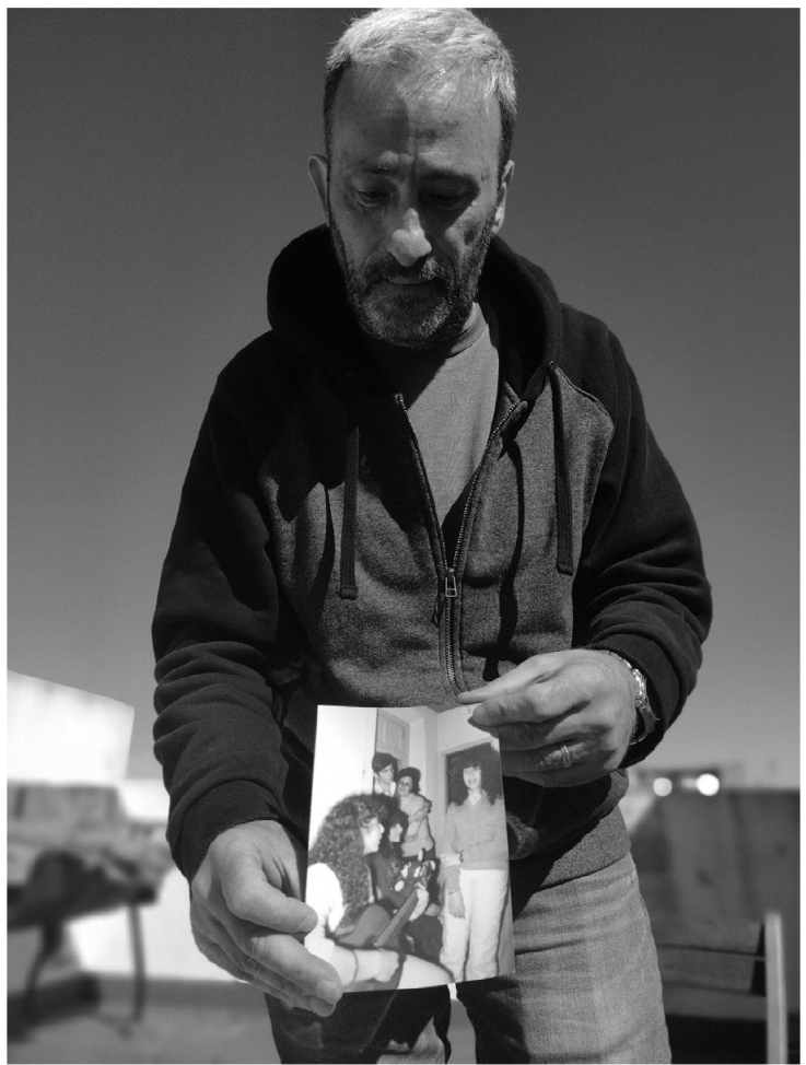 Figura 4 Silvio mostrando a la cámara la fotografía de la celebración de su regreso de la guerra.
