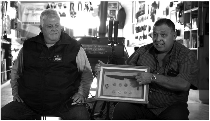 Figura 5 Julio muestra el cuchillo recuperado de las Islas Malvinas ante la mirada de José.