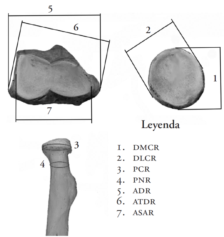 No se tomaron las medidas en las regiones donde se presentaban alteraciones (fracturas, entesopatías, artrosis, etcétera) que pudieran modificar el valor de las mismas. Las siete mediciones se realizaron utilizando una cinta métrica fina (CM) y el calibre vernier (CV), la primera con un error de 1mm y el segundo con 0.05 mm de error.