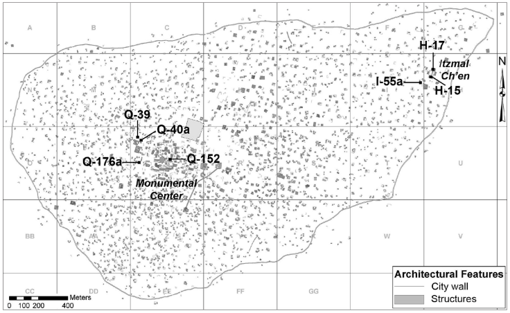Mayapán is located on the Yucatán Peninsula in Mexico and was the political capital and largest urban center of the Postclassic Maya world from 1200-1450 AD. The nucleated urban zone is circumscribed by a wall with a circumference of 9.1 km and 12 formal gates (Masson and Peraza Lope 2014; Masson et al. 2016: 241). Dispersed houselots are located beyond the city wall to a distance of 500 m (Russell 2008). The monumental center of Mayapán features mostly religious architecture, civic and administrative buildings, and elite residences (Chase 1992: Fig. 8.4; Delgado Kú 2004: 11-13; Smith 1962: 265-266). Outlying ceremonial sites probably used for local celebrations in the style of those held in the monumental center (Peraza Lope and Masson 2014a) were erected within the city limits. Elaborate elite residences in Mayapán are located around the eastern and western margins of the site center while lower-class neighborhoods throughout the city were mostly occupied by commoners (Hare et al. 2014: 170, 190).