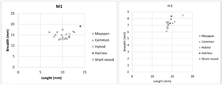 Note: m1= lower first molar, M1= upper first molar, L= Length, B= Breadth. Ranges for lower first molar length by breed: Mesoamerican common dog= 18.7-21.2 mm (Rodríguez et al. 2001; Valadez et al. 2004); mexican hairless Dog=17.1-19.9 mm (Rodríguez et al. 2001; Valadez et al. 2009); short-nosed Indian dog=17.5-18.7 (Allen 1920; Hamblin 1984; Valadez 2000); Tlachichi=18.5 mm (Valadez 2000); dog-wolf hybrid= 25 mm (Valadez et al. 2001).