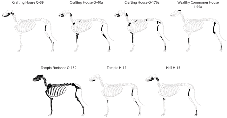 Age estimation based on epiphyseal fusion stages suggests the importance of adult specimens and indicates that, in most cases, dogs were allowed to grow to their full size, which is expected in domestication practices. Younger specimens based on fusion rates were found at Templo Redondo, Hall H-15 and artisan’s house Q-40a.
