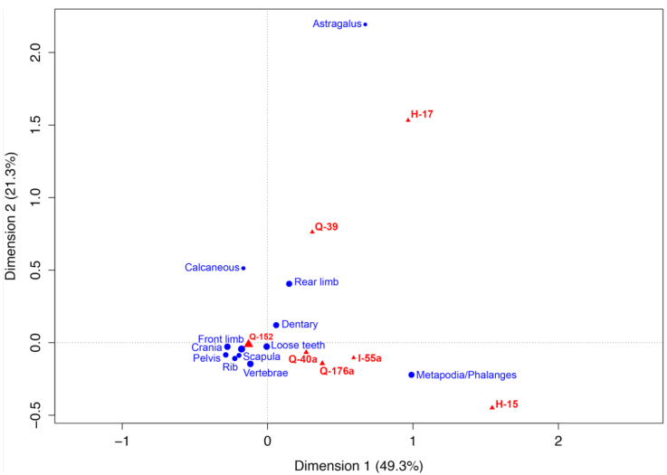 A correspondence analysis for the distribution of skeletal elements in each structure indicates the relationship between structures and the number of skeletal elements recovered from them (Figure 3). The structures with similar distributions are represented by their proximity in the graph. The proximity of the structures to specific elements illustrates the relative frequency of said element in the structure. Two artisans’ houses (Q-40a and Q-176a) have similar compositions to I-55a and are close to Q-152. As mentioned above, Templo Redondo (Q-152) is the structure with the highest number of elements. The Hall (H-15) shows a particularly different composition with a larger number of metapodials and phalanges. The Temple (H-17) is the only structure apart from Templo Redondo where astragali were recovered. Similarly, the artisan’s house Q-39 is the only structure apart from Templo Redondo where calcanei were found.